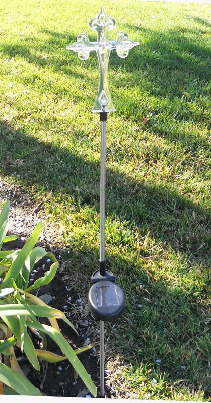 Add these 2 cross solar lights in floral arrangements for funerals, cemetery, roadside memorials or in your garden. Each of these cross solar lights has a unique design, which features an integrated solar panel on the stainless steel stake. The clear acrylic cross solar light will give off a spectacular lighting effect at night. Simply stake the light in the ground where it will receive at least 6 hours of sunlight a day, then the sensor switch will automatically turn on at night providing up to 8 hours of light when fully charged.