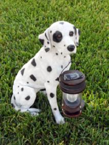 This solar garden statue features a dalmation solar dog statue carrying a solar powered lantern fitted with a super bright LED bulb. This solar dog statue will make a great gift for any dog or garden decor enthusiast. The light turns on automatically after dusk to add a colorful fun accent to your porch, patio or yard. You won't mind this cute dog in your flowerbeds, not with the great lighting provided from the power of the sun!