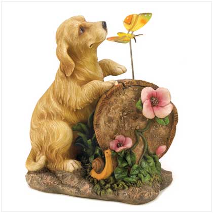 Add this charming playful pup statue with solar light butterfly to your garden, patio, deck or your favorite outdoor setting. Makes a interesting accent piece during the day then when night falls the colorful butterfly will shine on your garden providing light for up to 8 hours. Easy to install, just place the solar statue in an area that will receive plenty of sun during the day, then at night the photo sensor will automatically switch the light on at night.