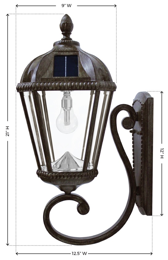 Add a New Orleans style to your home and entryway with this Royal Solar Wall Mount Light with attractive weather bronze finish. This solar light is equipped with Gama Sonic’s new patented Solar Light Bulb combined with their patented cone reflector will provide ample lighting with an elegant classic design. The Royal solar light is easy to install and requires no wiring, digging or electricity. Just install the solar light on any flat vertical surface and it will shine bright up to 8 hours each night and will add the perfect touch to your home, office or shed.