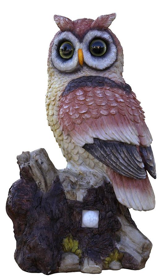 Add this hand crafted motion sensor solar powered owl decoy to your outdoor garden area to help keep birds or other pests from you plants and home. This life-like owl sculpture features a motion sensor that activates the owls hooting sound, and flashing eyes and with it’s realistic resemblance this owl decoy will deter unwanted pests from your property. Each solar powered owl comes with easy to setup hardware to install on branches, posts, fences or anyplace that you need an outdoor deterrent.